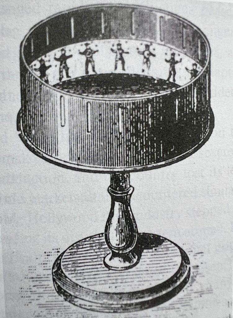 Here is another early example of a similar device invented the following year, in 1833, called the Zoetrope, which was widely sold after 1867. As the viewer looked through the revolving slots, they received the impression of moving images.