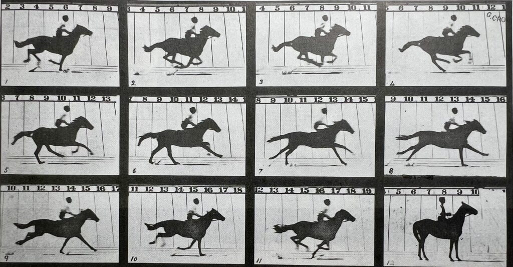 In 1878, a man named Eadweard Muybridge was asked by California ex-governor, Leland Stanford, to help analyze motion so he devised a method to study the motion of horses, using a set of 12 cameras, each making an exposure of just ½ second of the horse’s movement. Muybridge then devised a lantern to project the moving images of horses copied from the photographs onto a revolving disc, and in this manner made a significant contribution to understanding movement.