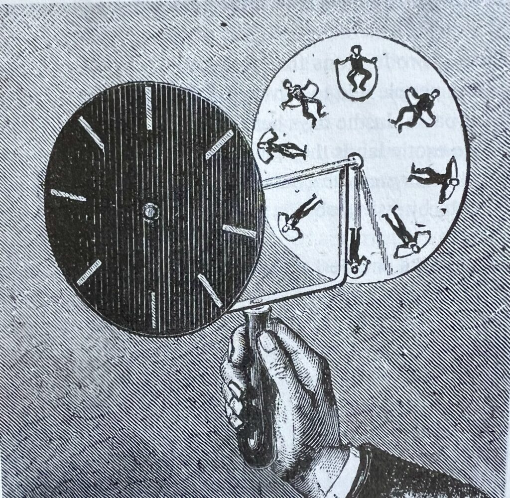 Let’s travel through time, all the way back to 1832, when physicist Joseph Plateau and mathematician Simon Stampfer created a device called the Phenakistoscope. As someone looked through a slot in the stationary disc, they received the impression of motion of the Phenakistoscope’s spinning disc.
